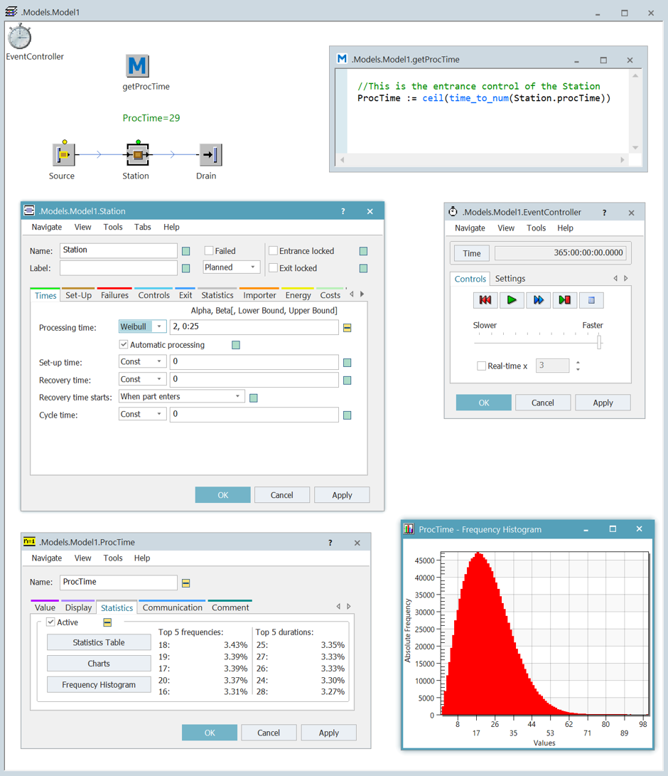 Gondoljunk csak bele, hogy milyen egyéb lehetőségeink adódnak a változó statisztika aktiválásával: Pl. fejlesztünk egy saját objektumot, aminek vannak különböző állapotai (dolgozik, várakozik, szerszámot cserél, beállít, meghibásodik stb.), akkor ezzel a módszerrel könnyedén vizualizálható az egyes állapotok felvételének gyakorisága. (Mgj.: a változónk string típusú és az egyes állapotokat veszi fel értékként, ahányszor azok bekövetkeznek.)