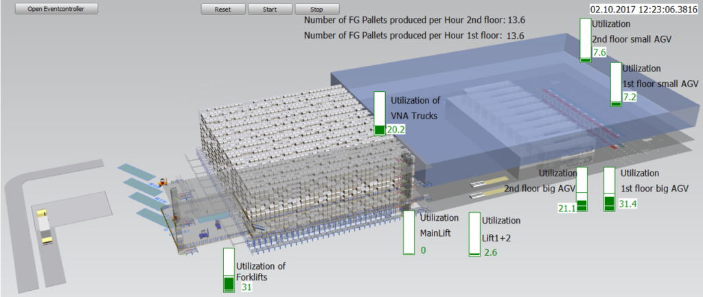 A Miebach szimulációs modellt készített az alapanyagok, csomagolóanyagok és késztermékek közbenső tárolására. A modell magában foglalta a termelési célú szállításhoz és ártalmatlanításhoz történő szállítás szimulációját is automatizált irányított járművekkel. Ez a szimuláció egyesítette ezeket az összetevőket, hogy feltárja a gyártó potenciális hatékonyságát.