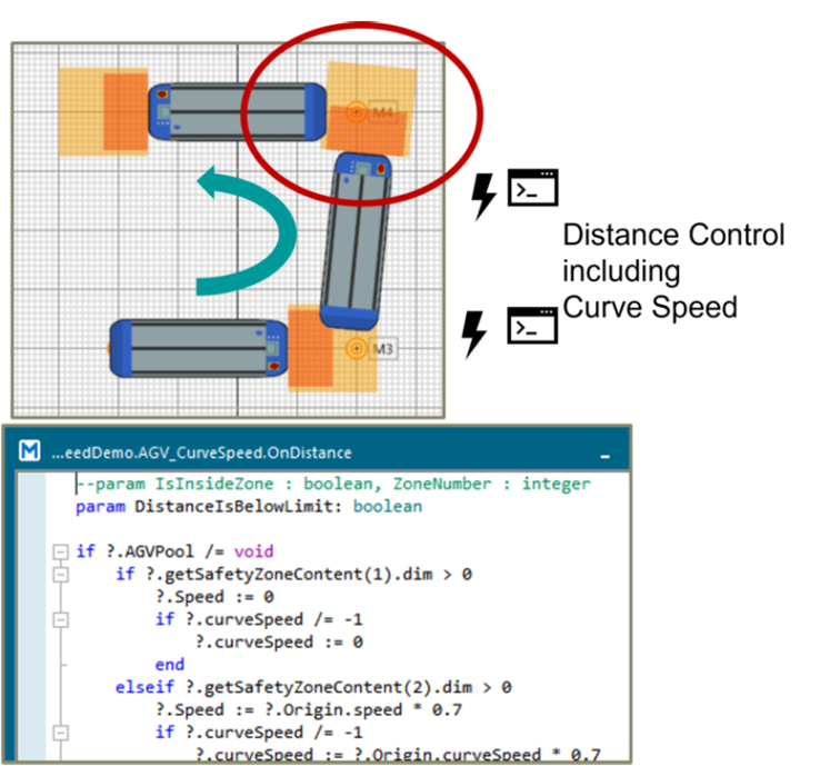 - Az útvonal íves részein is szabályozható az AGV sebessége, azaz lehetőség van távolságszabályozásra csökkentett kanyarsebesség mellett, ugyanis sebességcsökkentés nélkül előfordulhat, hogy az AGV nem képes időben megállni ütközés nélkül.