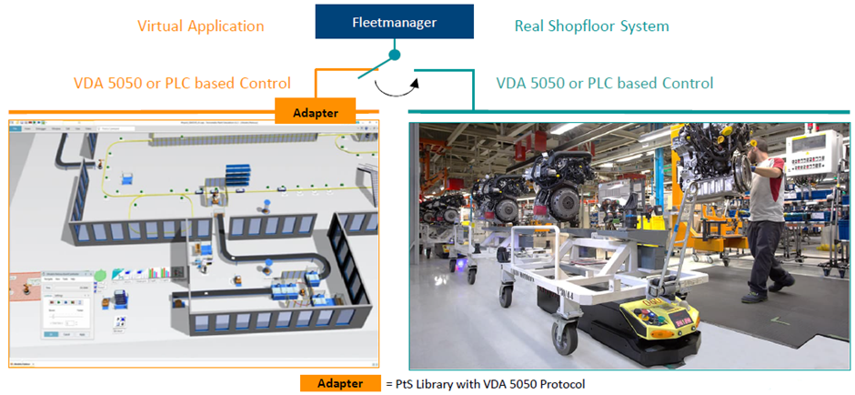 A fentiek alkalmazásával, AGV flotta virtuális beüzemelése, példaképpen a következő ábrán látható.