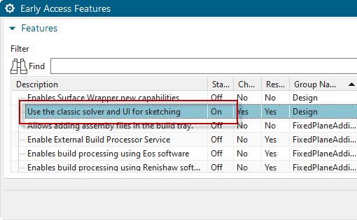 NX1926/1953/1980: A klasszikus sketcher visszakapcsolása az alábbi opció „ON”-ra állítása. (Jobb klikk-re ugrik elő az ON/OFF választó)