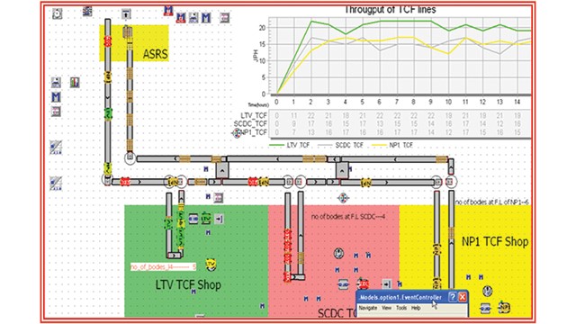 „Az egyik megvizsgált opció az óramutató járásával megegyező irányban történő keresztezés nélküli testáramlás volt. A szimuláció megmutatta, hogy abban az esetben, ha a három TCF vonal egyikét leállítják, a fő sor megfelelő karosszériái blokkolják a többi karosszéria másik TCF sorra történő mozgatását. A másik esetben az óramutató járásával ellentétes irányú áramlást vizsgáltak egy keresztezéssel, hogy az üres csúszkák visszakerüljenek a festéküzembe. Ez egy robusztusabb lehetőség, mivel minden TCF adagoló vonal gyakorlatilag független másoktól. Tehát csekély, vagy egyáltalán nincs hatással a vonali leállítások általános teljesítményére. ”