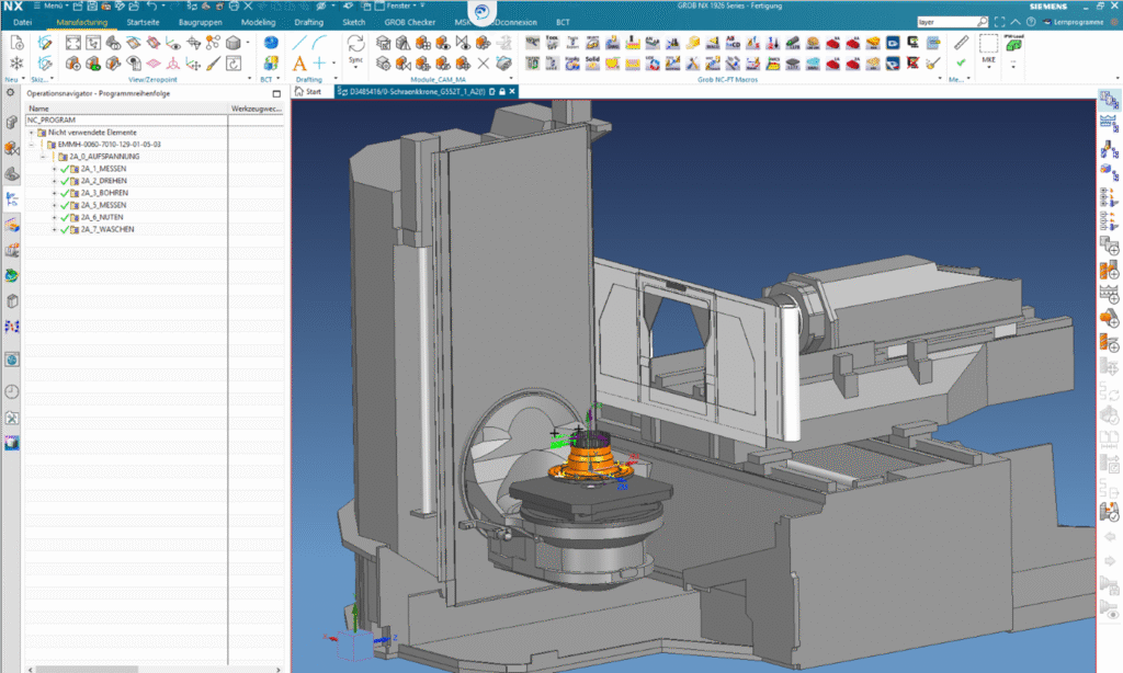 A GROB a Siemens NX CAD és CAM szoftvereit használja a géptervezés és CNC programozás automatizálására. Az intelligens felismerési algoritmusok révén a furatok és geometriai jellemzők nagy részét automatikusan azonosítja, így a programozási idő akár 30%-kal is csökkenthető. A Teamcenter PLM rendszer lehetővé teszi a globális mérnöki együttműködést, az ERP integrációt és az anyagjegyzékek gyors, hibamentes kezelését. Az anyagjegyzékek összeállítása 80%-kal gyorsabb, míg a hibák száma 95%-kal csökkent.