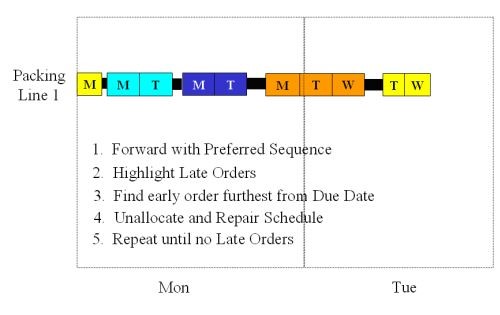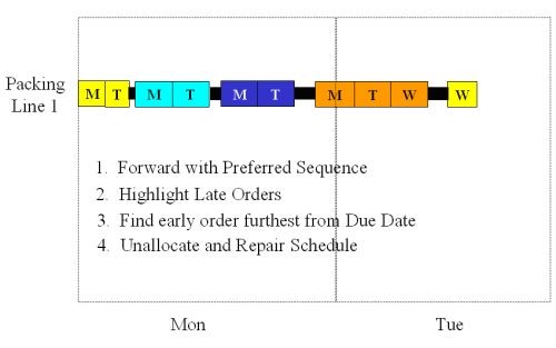 Első körben a szabály a kívánt szekvenciába ütemezi be a rendeléseket az 1. sz. csomagolósorra. Az alábbi ábra mutatja a citromsárga, világos kék, sötét kék és narancssárga színnel jelölt és sorrendbe tett batcheket. Az ”M” ”T” ”W” jelölések azt mutatják meg mikor esedékes a csomag. Az ”M” hétfőn, a ”T” kedden és a ”W” szerdán.