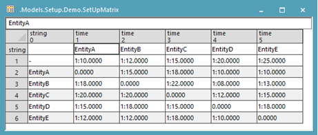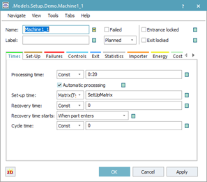 A példa projektben valamennyi állomásnál beállítottuk a Times \ Set-up time paramétert a Matrix(Type) típusra, majd megadtuk a fenti SetUpMatrix táblát adattábla forrásként.