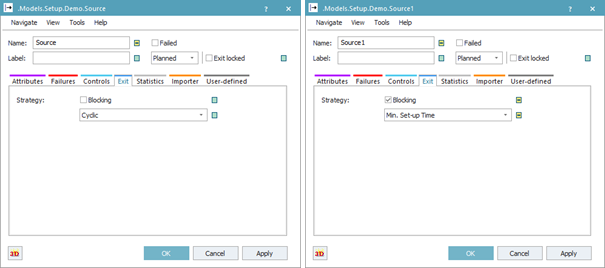 Az állomások átállási idejének megadása után a két bemenet (Source) objektumot is szükséges beállítani. A felső gépcsoportot ellátó bemenet objektum tulajdonságainál a kilépési stratégia ’Cycle’ – ciklikus, míg az alsó gépcsoportot ellátó forrás (Source1) kilépési stratégiája ’Min. Set-up Time’.