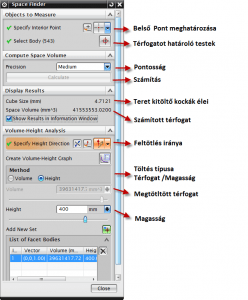 Ha nem egy testnek vagyunk kíváncsiak a térfogatára, hanem csak egy elhatárolt térrésznek, melynek határait több komponens is adhatja, nem kell, hogy egy test legyen, akkor az Analysis/Space Finder parancsra lesz szükségünk.