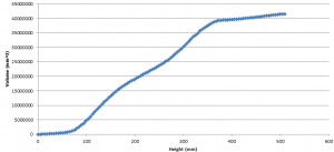 Az eredményekről megtekinthetünk egy kitöltési diagramot excelben, melyben a feltöltés magasságának függvényében ábrázolja az NX a térfogatot.