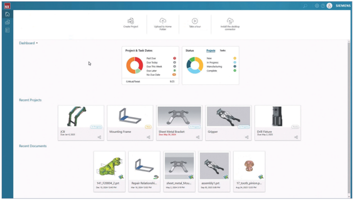 A CAD nézet és jelölés bármely eszközön elérhető, lehetővé téve a modellek megtekintését, mérését és jelölését egy háromdimenziós, mérnöki szemléletű térben. Jegyzetek és megjegyzések adhatók hozzá, nagyítható, forgatható és vizsgálható a modell. Minden jelölés és megjegyzés teljeskörűen nyomon követhető és elérhető az NX X Essentials-en belül, teljes átláthatóságot biztosítva a projekt felülvizsgálati folyamatban. Az Augmented Reality (AR) lehetővé teszi, hogy ezeket a terveket valós környezetben tekintse meg okoseszközén, még mielőtt elkészülne. Az NX X Essentials zökkenőmentes, valós idejű együttműködést tesz lehetővé a beszállítók, az értékesítés, a kutatás-fejlesztés (K+F) és az ügyfelek között. Bármely eszközről gyorsan lehívhat és szerkeszthet natív NX fájlokat az ügyféltárgyalások során, azonnali tervezési módosításokat végezhet a gyártósoron, és új koncepciókat modellezhet a meglévő könyvtári tartalmak felhasználásával. Az NX X Essentials feladatkezelésével határidőket állíthat be, priorizálhat és referencia projektfájlokat kezelhet a szállítandó anyagok hatékony kezeléséhez és nyomon követéséhez. Az interaktív projekt irányítópultok valós idejű figyelést és követést biztosítanak a projekt és munka státuszokról. A projekt-feladat Kanban táblák lehetővé teszik a „ki, mit csinál, mikor és milyen sorrendben” történő egyszerű kezelését és követését; a befejezett feladatokról azonnal értesítések érkeznek. A projekteket konkrét személyekhez lehet rendelni, és jegyzeteket lehet hozzáadni, hogy mindenki összehangoltan és jól informáltan dolgozzon. Az élő gyártási státusz az ügyfelekkel is megosztható. Az interaktív irányítópult garantálja, hogy minden lényeges információ elérhető egy egyszerűen megtalálható helyen. A projektek és feladatok a Siemens Teamcenter Share-rel is megnyithatók további együttműködés és skálázhatóság érdekében.
