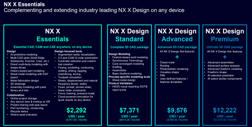 Az NX X Essentials lehetővé teszi a tervezés felgyorsítását mesterséges intelligencia (AI) alapú modellezéssel és automatizált rajzokkal; biztonságos megosztást az együttműködéshez bármikor, bárhonnan, bármilyen eszközről; projektek és feladatok tervezését, végrehajtását és nyomon követését; CAD modellek megtekintését, jelölését és szerkesztését, valamint a tervezési teljesítmény validálását integrált CAM és szimulációs eszközökkel fizikai és virtuális prototípuskészítéshez.