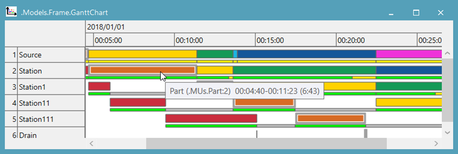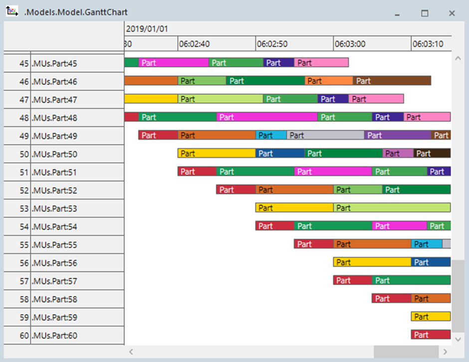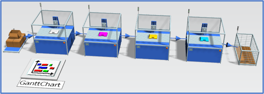 A GanttChart, a Plant Simulation opcionális objektuma, amely segítségével összegyűjthetők és megjeleníthetők a darabok gépeken eltöltött ideje (Erőforrás nézet), továbbá a gépek aktuális állapotai („working”, „setup”, „failed” stb.) is láthatók. Az egeret az aktuális sáv fölé mozgatva részletes információt kapunk az aktuális darab, aktuális gépen eltöltött idejéről (kezdete és vége).