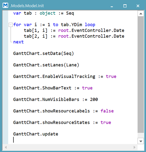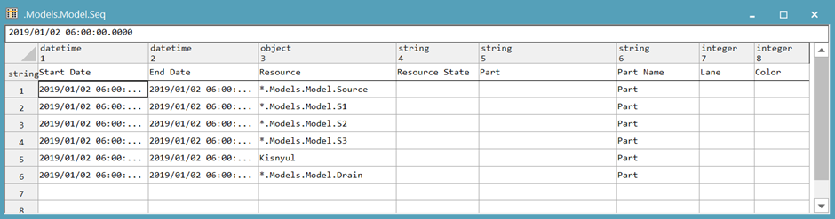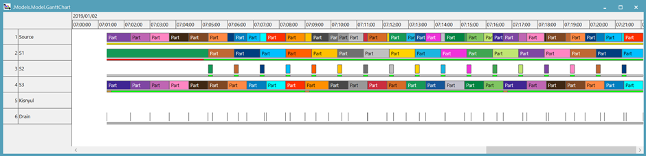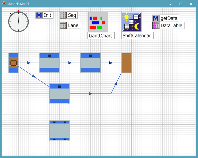Az alap modell egy egyszerű anyagáram szimuláció, ahol a Lane tábla segítségével szabhatjuk testre a GanttChart sorainak méreteit, továbbá egy Seq tábla alapján pedig definiálhatjuk a gépek sorrendjét is.