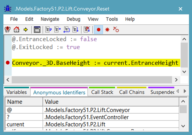 A Plant Simulation hibakeresési környezete egyre jobban növekszik. A már korábbról jól ismert hibakeresőnk egy törésponton állva, példaképpen az alábbi ábrán látható.