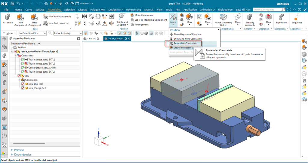 Az így elkészített összeállítást akárhányszor felhasználhatjuk a satu lemásolása nélkül. Fontos ,hogy a satu hozzáadásakor –, amikor a kényszereket újradefiniáljuk – figyeljünk az alkatrész és a satu egymáshoz viszonyított tájolására.
