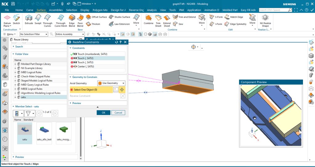 Nyissuk meg a munkadarabunkat, vagy a már kész megmunkálás setup-ot és a Reuse Library-ból húzzuk be a munkadarab modellterébe a Satu-t.