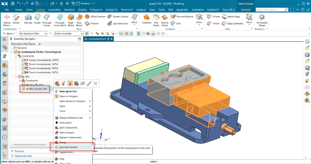 A megfelelően létrehozott satu összeállítás lehetővé teszi, hogy minden fájlban különböző pofa távolsággal használjuk ugyanazt a készüléket, anélkül, hogy minden alkalommal új másolatot kellene készíteni. Első lépésben készítsük elő az összeállítást, amely tartalmazza a komponenseket – az alaptestet (satu_allo_test.prt) és a mozgópofát (satu_mozgo_test.prt).
