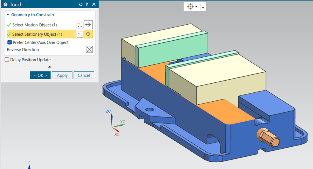 Következő lépésben megadjuk a megfelelő kényszereket – jelen esetben egy központosítás (Center) és egy érintés (Touch) – az alaptest és a mozgópofa összeszereléséhez.