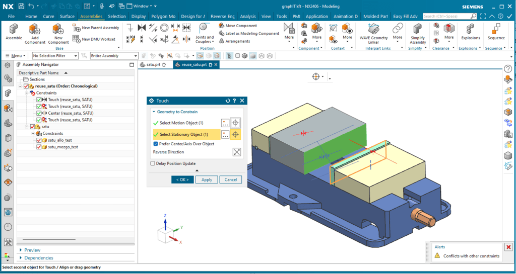 Végül a mozgópofát kötjük hozzá a munkadarabhoz. Ez az utolsó kényszer, amit itt megadtunk. Jelenleg a „Conflicts with other constraints” üzenet jelenik meg a túlhatározottság miatt, de ezzel nem kell most foglalkoznunk, OK-val jóváhagyjuk.