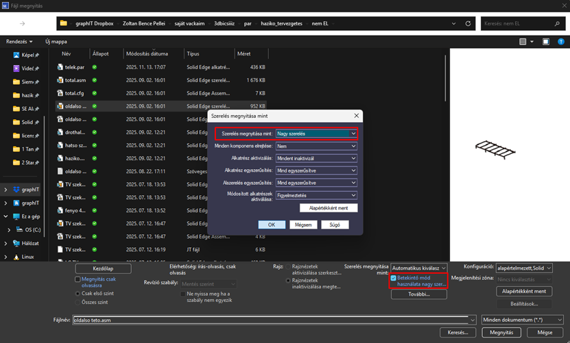 Bejelölésével a szerelési csoportok kiemelése egy négyszögletes befoglaló hasábbal történik, a teljes geometriai megjelenítés helyett. Az említett beálltás növeli a megjelenítési teljesítményt a komponensek kiemelése és kiválasztása során. Érdemes megfontolni ezen opciót nagy szerelési munkák alkalmával.