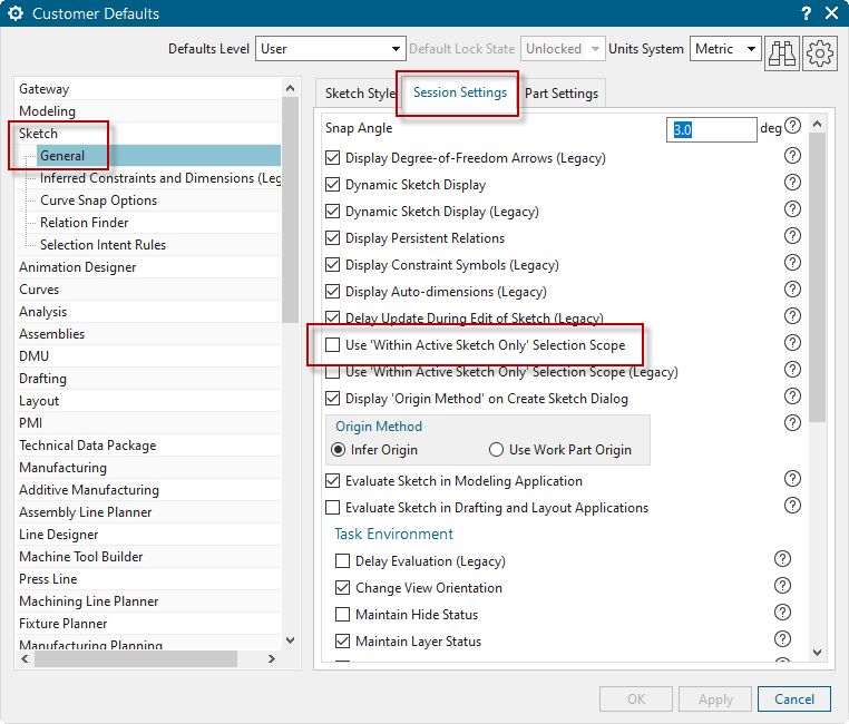 Az NX sketch-hez tartozó mélységi szűrőt a Customer Default -ban át kell állítani! Ha megnyitjuk a beállításokat, látszik is, hogy a klasszikus (Legacy) szerkesztőben a „Within Active Sketch Only” nincs bepipálva, az új szerkesztőhöz tartozó beállításnál viszont igen. Ez az oka, hogy az új szerkesztő mindig ezt a szűrő funkciót használja automatikusan, minden indítás után. De ez a megoldás kulcsa is: vegyük ki a pipát, majd újraindítás és mostantól a „Within Work Part Only” lesz az alapértelmezett szűrő Sketch környezetben.